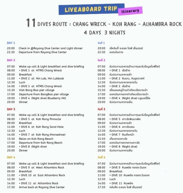 ***หมายเหตุ เวลาและจุดดำน้ำสามารถเปลี่ยนแปลงได้โดยไม่ต้องแจ้งให้ทราบล่วงหน้า เนื่องจากสภาพอากาศ***