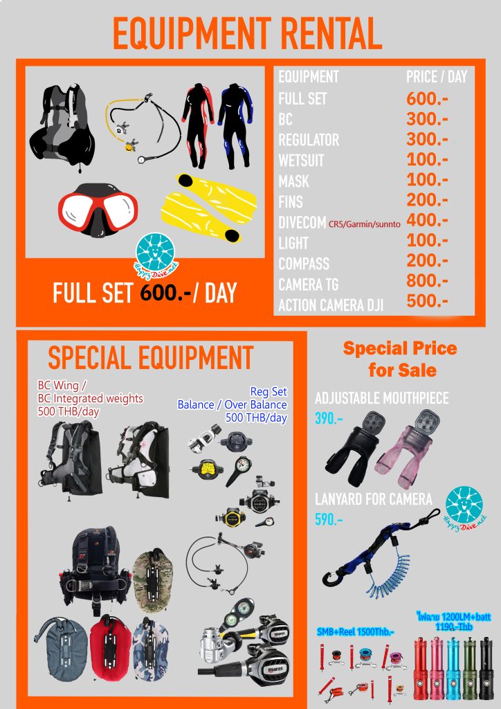 - ค่าเช่าอุปกรณ์ดำน้ำ 500 บาท/ชุด/วัน